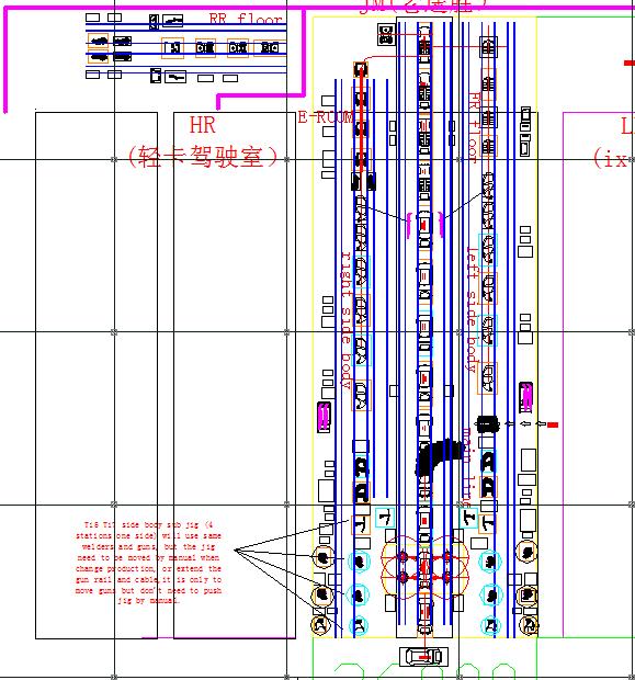 主焊線共13個工位,采用升降滾床+滑橇輸送形式;左右側圍總成上線采用人工預裝上線,前頂橫梁、后頂橫梁采用人工預裝上線,頂蓋總成上線采用人工吊具上線;發艙總成、前底板總成、后底板總成采用吊具上線。